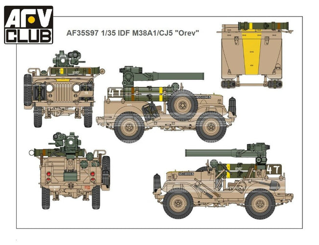 Vendor:AFV CLUB1/35 IDF 1/4 TON 4x4 M38A1/CJ05 ANTI-TANK MISSILE VEHICLE BY AFV CLUB AF35S97 AFV Club (Taiwan) - 1/35 IDF M38A1/CJ-5 "Orev" 1/4 Ton 4x4 w/ TOW Missile Some of the kit Features: Newly Tooled IDF M38A1/CJ-5 tools and accessories Newly Tooled IDF M38A1/CJ-5...