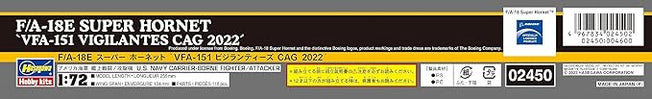 Vendor:HasegawaHasegawa 02450 1/72 US Navy F/A-18E Super Hornet VFA-151 Vigilantes CAG 2022 Plastic Model This plastic model requires assembly and painting. Adhesives, tools, paints, etc., sold separately 1/72 scale unpainted plastic assembly kit Finished Size: 10.0 x 7.3 inches (255 x 184 mm) Patch...