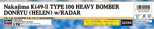Vendor:Hasegawa1/72 NAKAJIMA KI49-II TYPE 100 HEAVY BOMBER DONRYU HASEGAWA 02294 1/72 scale plastic model kit of the Nakajima KI49-II Type 100 Heavy Bomber Donryu.