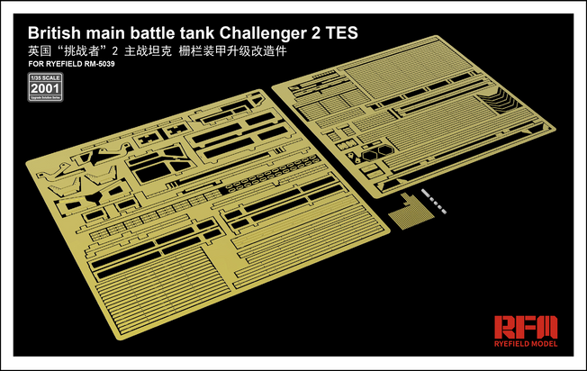 Vendor:Rye Field ModelsRFM-RM2001 The Upgrade Solution for 1/35 British Main Battle Tank Challenger 2 TES This is Rye Field first release of their new "The Upgrade Solution" series. The purpose is to satisfy those modelers who want extra detail towards the perfect scale model kit....