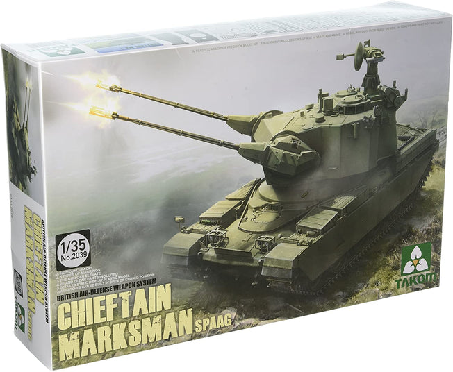 Vendor:Takom1/35 CHIEFTAIN MARKSMAN SPAAG ANTI-AIRCRAFT WEAPON SYSTEM with BRITISH AIR-DEFENSE WEAPON BY TAKOM 1/35 Scale Unassembled Plastic Model kit - Glue & Paint not Included. During the Cold War, the British Army needed to provide their armored units a highly mobile tracked self-propelled...