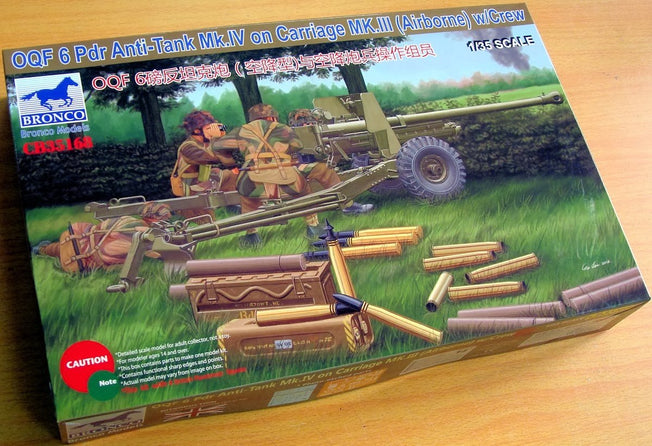 Vendor:Bronco Models1/35 OQF 6 PDR ANTI-TANK MK.IV ON CARRIAGE MK. III (AIRBORNE) W/CREW BRONCO MODELS CB35168 1/35 Scale Unassembled Plastic Model Kit - Glue & Paint not Included.
