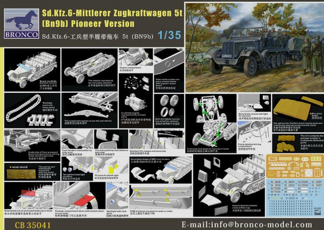 Vendor:Bronco Models1/35 SD.KFZ.6 - MITTLERER ZUGKRAFTWAGEN 5T (BN9B) PIONEER VERSION BRONCO MODELS CB35041 1/35 scale plastic model kit of the Sd.Kfz.6 Mittlerer Zugkraftwagen 5 ton, pioneer version.