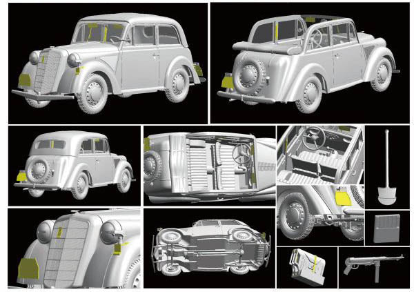 Vendor:Bronco Models1/35 GERMAN LIGHT STAFF CAR "STABSWAGEN' 1937 'SALOON' BRONCO MODELS CB35052 1/35 scale plastic model kit of a German light staff car, 'Stabswagen' 1937 (Saloon).