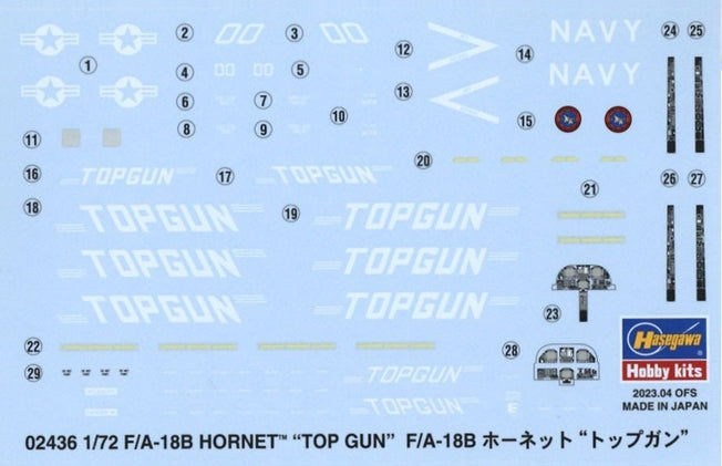 Vendor:Hasegawa1/72 F/A-18B Hornet with "Top Gun" marking HASEGAWA 02436 This is a 2023 Limited Production item from Hasegawa. 1/72 F/A-18B Hornet with “Top Gun” marking and all Black finishing. A very interesting marking even for “Top un” school. Perhaps inspired...