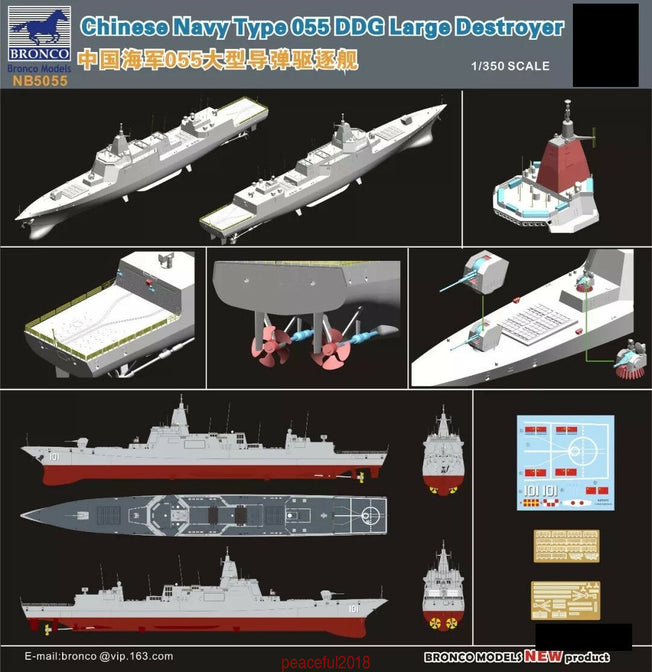Vendor:Bronco Models1/350 CHINESE NAVY TYPE 055 DDG LARGE DESTROYER BY BRONCO MODELS 1/350 Scale Plastic Model Kit with a high quality decal and Photo-etched Parts Glue & Paint not Included.